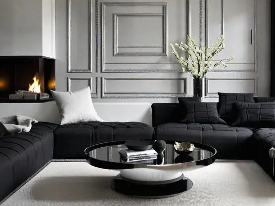 10% is for accents—this can incorporate metallics, glass, or common Luxury Black and White Living Room.
